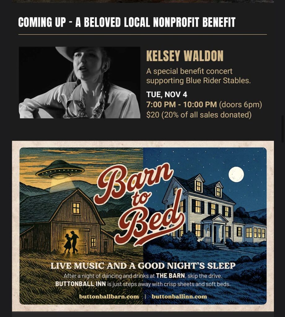 “Blue Rider is one of those places that embodies the heart of the Berkshires—grounded in care, community, and connection. This concert is our way of giving back and helping them stay strong through this unexpected challenge,” says Heather Thomson, new owner of The ButtonBall Inn and ButtonBall Barn