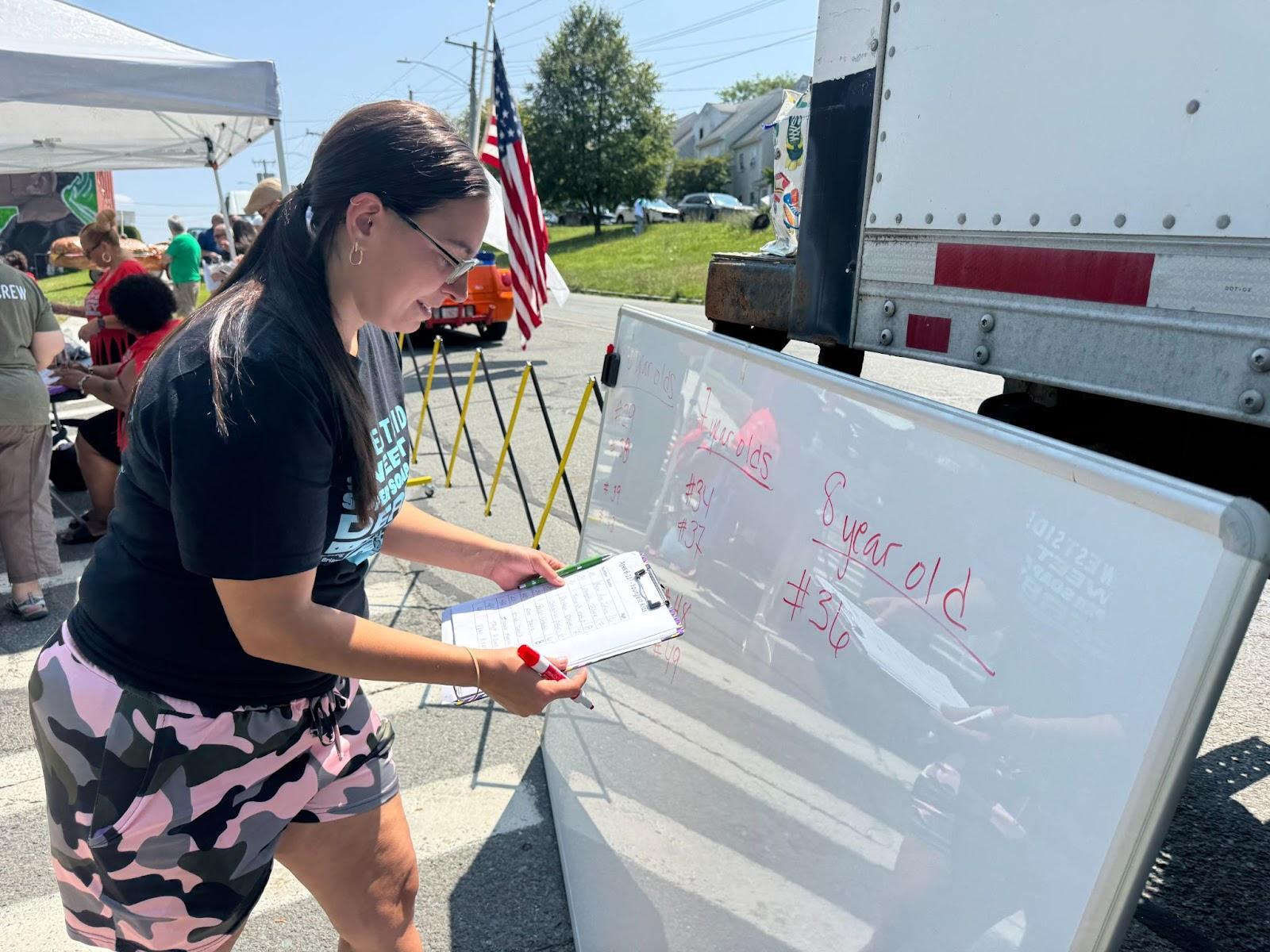 Luckily, they have a community of people eager to support. Tonya Frazier prints the roster in Expo marker on a whiteboard. She works for Habitat for Humanity just down the street, at 314 Columbus Avenue. “29, 38, 43, 50, 198,” she writes out— this is the six-year-old category. It seems like she knows most of the names behind these numbers and the faces and squeaky voices behind these names. She always helps out on derby day. Rebbeca Brien works for the community organization Downtown Pittsfield Inc., and today she distributes free water bottles to thirsty racers and spectators. Consuming these water bottles by the case are dads, who work as flagmen at the starting line. The sun is scorching. Sweaty brothers help T-shirted sisters into their soap-box cars.