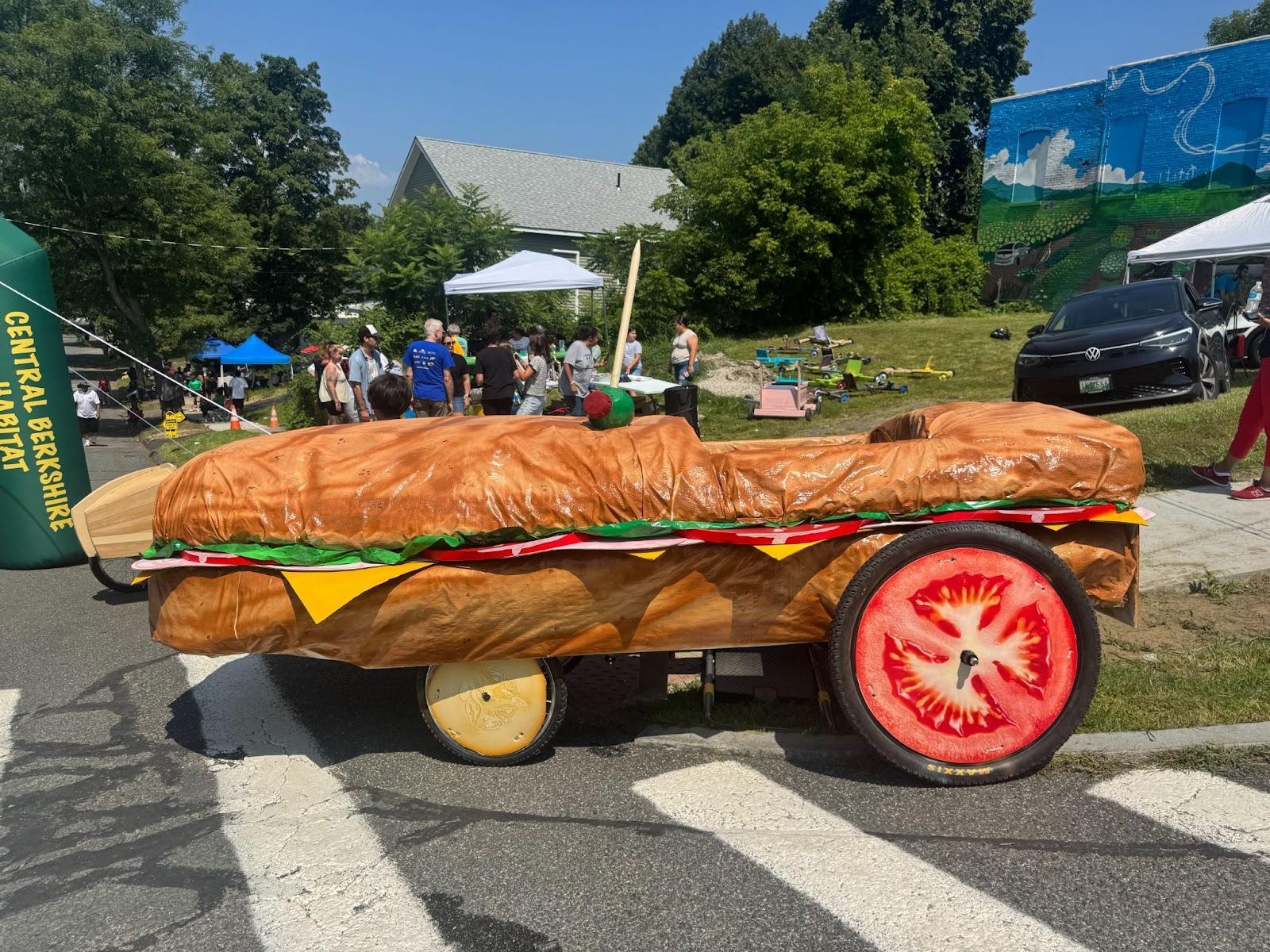 Fortunately, of derby day’s three age groups, the last is adults: “18 and older.” Because they, hopefully, will not crash à la #29 vs #43, they can afford to drive more ornate vehicles. Dolores Wright says that Blue Q, a local gift manufacturer, is known for an annual showstopper. This year, the car resembles a hefty sandwich, of the kind this neighborhood loves from Angelina’s Submarine Shops. Blue Q, with its tomato wheels and glutenous exterior, wins Best in Show. Interprint, a local printing company, wins first place—as in, they were fastest.