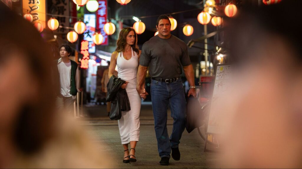 Propelled by a jazz score from Nala Sinephro, whose shifting rhythms mirror the changing tempos of Kerr’s life, Safdie frames Kerr less as a gladiator and more as an artist sacrificing himself for his craft. When Kerr and his girlfriend Dawn (Emily Blunt) watch a demolition derby, the crowd roars for the crashes but Kerr winces as he empathizes with the wrecked cars. It is a painful moment of recognition, but one that does not stop him from getting back to the gym the very next day.