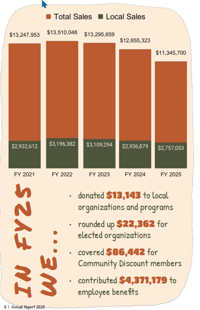 According to its annual report, both local sales and total sales have gone down in the past three fiscal years, including in fiscal 2025 with the Co-op making $11,345,700 in total sales, down by $1,309,623 from the previous fiscal year.