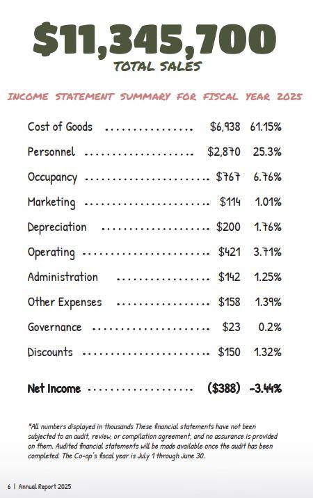 While the year-over-year improvement noted in the annual report reflects important progress, performance is measured not only by net results but also by long-term sustainability. Like many small businesses, we are navigating elevated costs across multiple categories, alongside shifting consumer spending patterns. Sales trends have softened compared to the unusually strong pandemic-era years. We continue to assess how best to align operations with current market realities while protecting the Co-op’s long-term health.