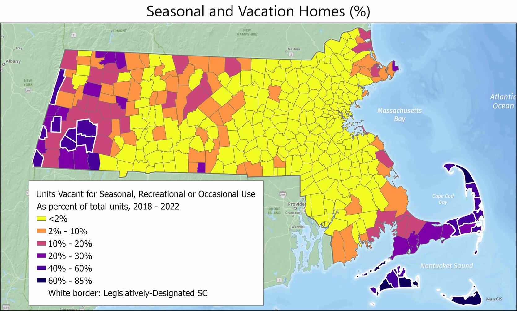 The Massachusetts Executive Office of Housing and Livable Communities (EOHLC) is tasked with administering the Seasonal Communities designation and developing its regulations. The department has identified 25 municipalities that are legislatively designated as Seasonal Communities, with those municipalities having at least 40 percent of their homes used seasonally, recreationally, or occasionally.