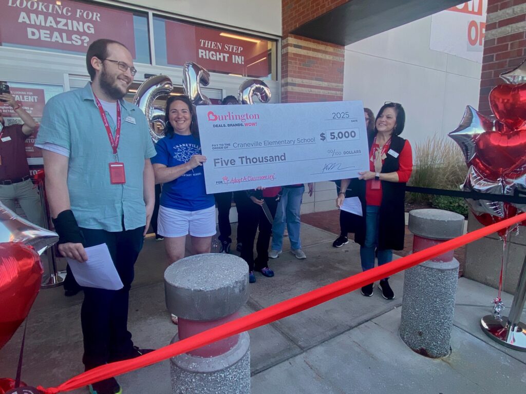 On behalf of Burlington Store, Comar and Store Manager Ryan Traficante presented a $5,000 check signed to Dalton’s Craneville Elementary School in conjunction with the corporation’s charitable initiative, the Adopt A Classroom program.