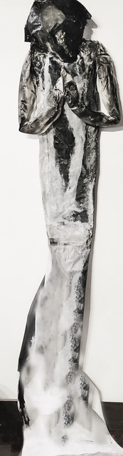 Gelburd’s process is as layered as her concepts. Using archival digital photographs, encaustic paints, sometimes wood and fiberglass, Gelburd’s artworks can be two or three dimensional. She always starts with photographs of nature, be it of the Berkshires, India, Africa, or Greece. Most of the works in this exhibition feature waterfalls and rivers from the Berkshires. The two-dimensional works are photo collages with encaustic paint while the three-dimensional works are photographs printed on fabric and then molded into humanoid forms. Many of the works include drawings of figures and faces hidden into the art. “This personification of nature”, said Gelburd, “seeks to visualize and remind us that we are our environment.”