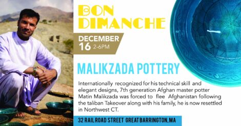 Molly and Aurelien de St André have reunited with their old friend and are featuring his work at Bon Dimanche. Malikzada will be onsite with his pottery wheel to do a live demonstration and a slide show of his work and its history. He will have an expanded collection of his pottery for sale and be available for questions and discussion. The free event is on Saturday December 16th from 2 p.m. to 5 p.m. at Bon Dimanche on Railroad Street in Great Barrington. More information can be found online.
