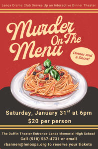 Lenox— On Saturday, January 31st at 6 p.m., The Lenox Memorial Middle and High School drama department presents “Murder on the Menu,” an interactive murder mystery dinner theater.