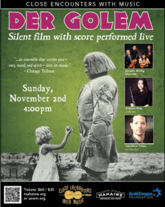 Great Barrington— On Sunday, November 2nd at 4 p.m., Close Encounters with Music presents a screening of the German expressionist masterwork “The Golem,” with live klezmer-infused accompaniment y the Avalon String Quartet at The Mahaiwe Performing Arts Center.