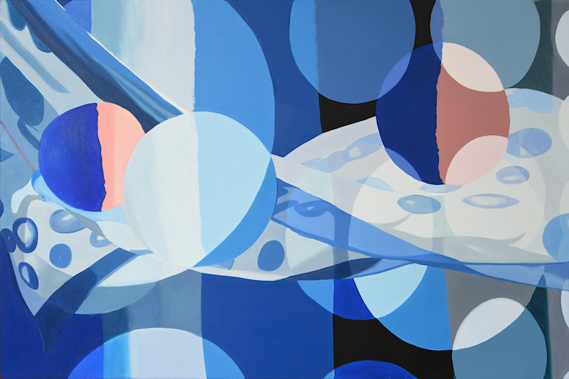 Absorbed in the process of creating the illusion of transparency in her paintings, Gardiner used the series as the foundation for her “Interlusion” paintings. She scaled-up the intimate collages into larger oil paintings, and by adding another layer of semi-transparent subject matter, evokes an atmospheric, surrealistic landscape.