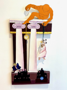 This piece by Lenox artist Carolyn Newberger entitled “I Dissent” uses three 8 x 24 panels to create a collage commentary on today’s Supreme Court and the plight of justice.