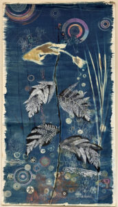 The works in this exhibit all contain the Prussian-blue tones of the Cyanotype process along with a wide variety of auxiliary mediums such as acrylics, colored pencils, cut paper, white out, and digital printing. A series titled “Ancestors” utilizes a collection of turn-of-the-century glass negatives while other themes are centered around nature and the impact on the imagination of global warming. These materials and techniques highlighted in this exhibit are an effort to explore the possibilities of an historic medium that has found a way of engaging the imagination of a contemporary artist.