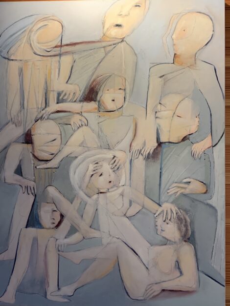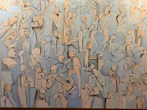 Gilroy’s work is an expression of an allegorical journey by the artist, a journey that emanates from simple, abstract sketches and pen strokes. These coalesce to form the crucible of an idea or feeling. From there, the artist simply follows his art: “The lines begin to self-organize with the allegorical pieces worked up from sketches….the gathering of forms will not expose themselves until I’ve started to cover the canvas.….a circle becomes a head…… a squiggle becomes a body. A line implies a limb.” ”I don’t know what the shapes represent until they reveal themselves to me like notes in a jazz improvisation…..one stroke foretelling the next.”