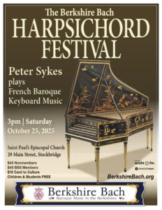 Stockbridge— On Saturday, October 25th at 3 p.m., Berkshire Bach Society concludes its annual harpsichord festival with a solo recital by distinguished harpsichordist Peter Sykes at St. Paul’s Episcopal Church.