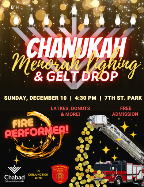 The celebration will feature a giant Menorah, a fire performer, and a unique “gelt drop” in collaboration with the local Fire Department. Mayor Kamal Johnson and other Hudson public officials will be joining the festivities.