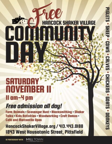 The free community day is on Sunday, November 11th from 11 a.m. to 4 p.m. at Hancock Shaker Village on West Housatonic Street in Pittsfield. More information can be found online.