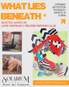 Pittsfield– On Thursday, March 19th from 6 p.m. to 8 p.m., Solarium Plant Shop celebrates the opening of “What Lies Beneath,” an exhibit featuring the work of Lucie Castaldo and Melissa Matsuki Lillie.