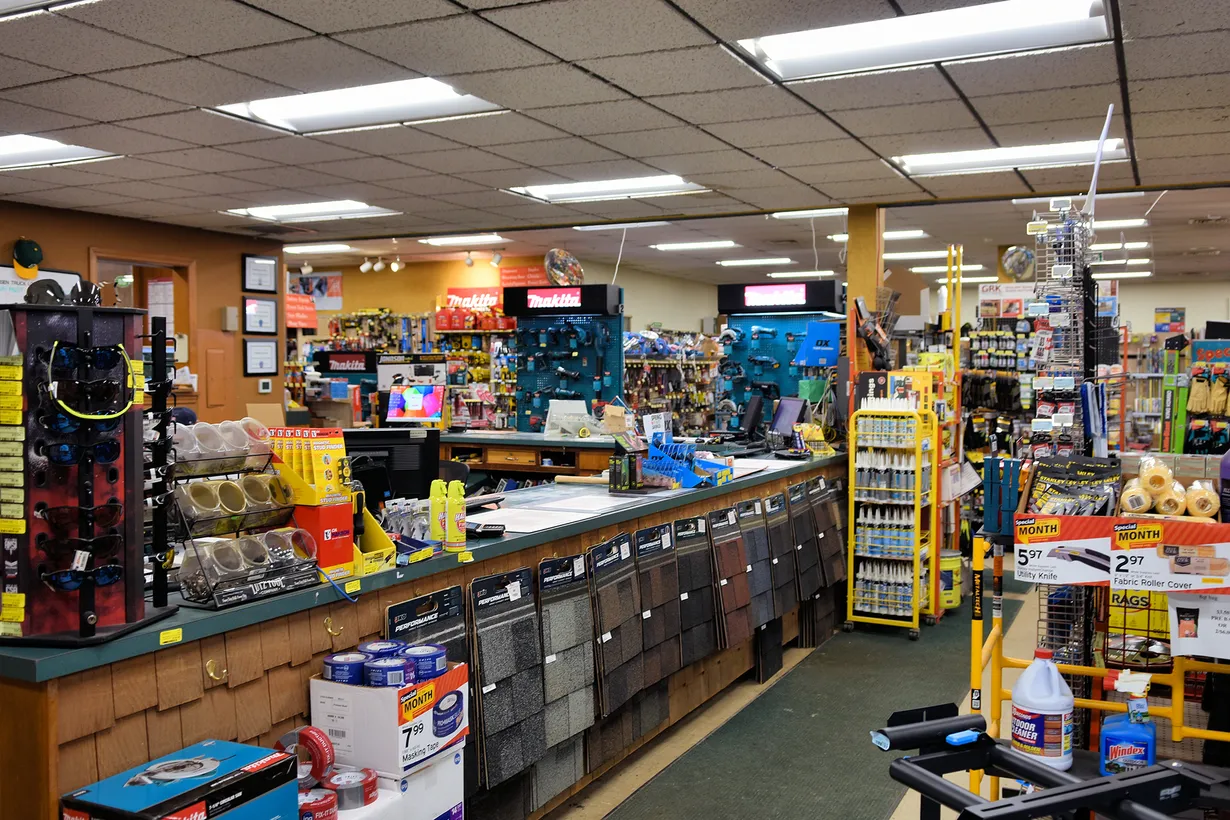 Dettinger offers an extensive selection of lumber, including pressure-treated wood, SPF (spruce, pine, fir) dimensional lumber, plywood, and Eastern White Pine boards. They also sell a variety of other materials, including concrete, roofing supplies, drywall, insulation, and siding, as well as cabinets, countertops, flooring, doors, and windows. The hardware store stocks a wide range of tools, paints, and electrical and plumbing supplies, among other items.