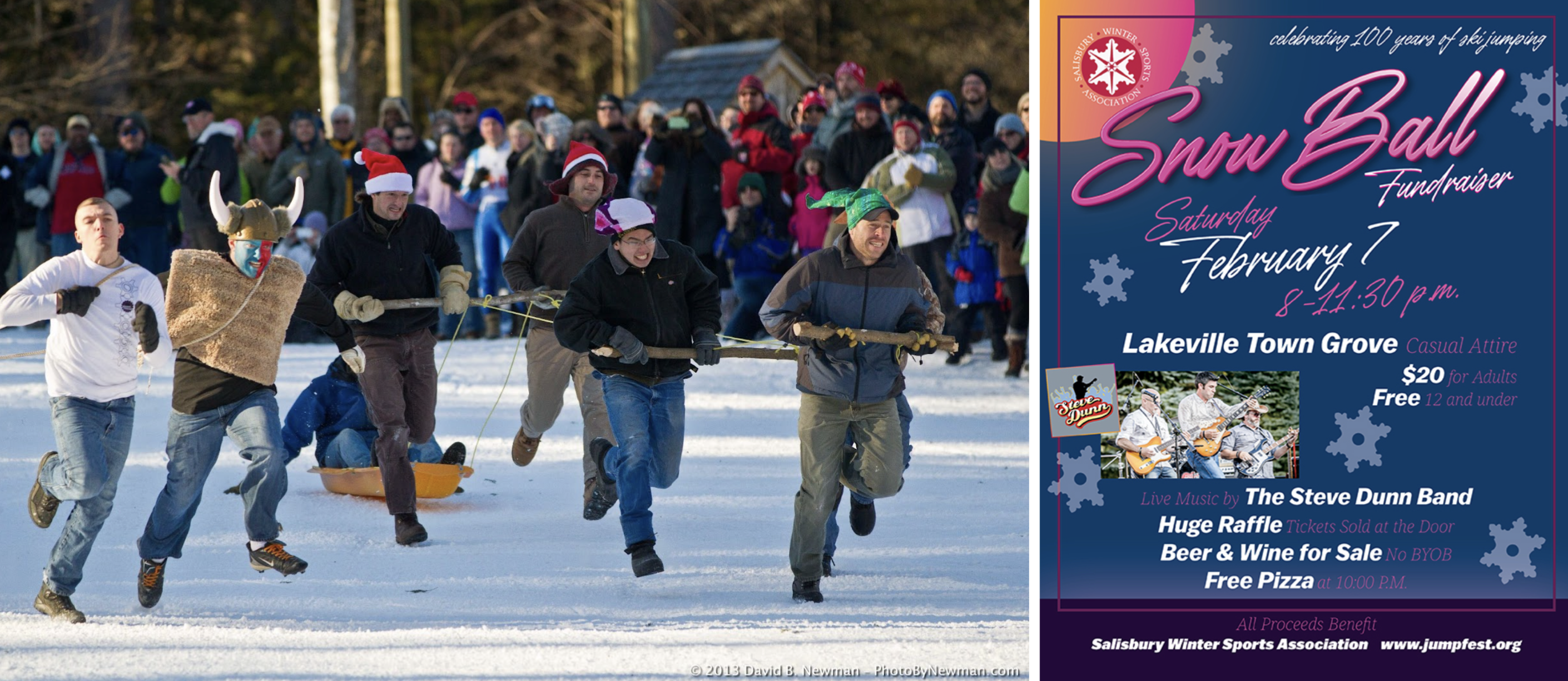 Now sponsored and run by the Salisbury Winter Sports Association (SWSA, pronounced “Swa-sa”), it has become Salisbury’s signature annual winter event, bringing crowds from throughout New England, along with booming business for local venues. Jumpfest weekend features Target Jumping under the lights, the Human Dog Sled Race, and fireworks (all part of this year’s Friday opening night festivities); the Saturday Invitational (Eastern Junior Cup—20 Meter and 36 Meter Small Hills Competition; 70 Meter Salisbury Invitational Ski Jumping Competition) and Snowball Fundraiser; and the 70 Meter Eastern Ski Jumping Championships and Nordic Combined Race on Sunday. All the action is announced by Dale Jones, a former jumper himself who has spent a lifetime in radio and has been volunteering at Jumpfest for decades.