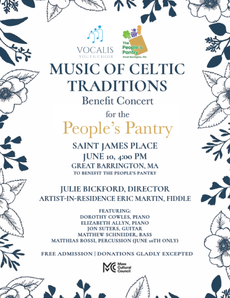 The Vocalis Youth Choir will perform two free concerts (donations are accepted at the door) in June as part of their Celtic Choral Music Series. The first will open the seventh season of Music at The Southfield Church (New Marlborough) on June 3rd at 7 p.m.—an opening concert sure to lift your spirits and get your toes tapping. The second (home) concert will be held on June 10th at 4 p.m. at Saint James Place (352 Main Street in Great Barrington).