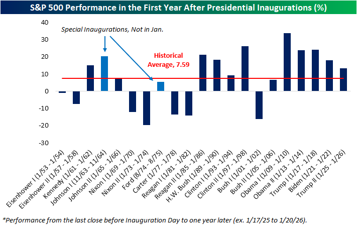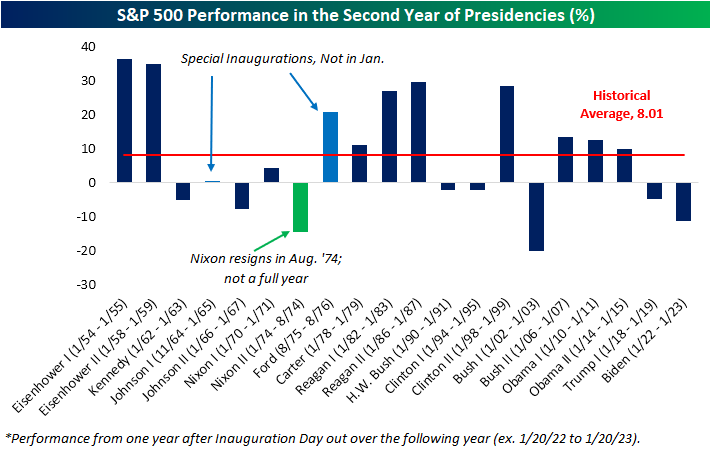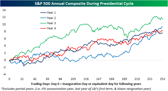 Positive gains in the first year of a president’s first term have become common, with only one down year in the last 44 years. That one down year was during the dot-com bubble implosion in 2001.
