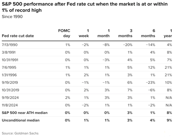 Could it be different this time? Of course. In particular, you may be wondering what happens to stocks after a rate cut if the market is trading at or near its highs, as it is now. Of course, between now and an assumed rate cut in September 2025, the stock market could be significantly lower, which might make that concern moot. But let’s explore it now in case we need to consider it later. Going back to 1990, there have been nine occurrences when the Fed cut interest rates while the S&P 500 was trading within one percent of a record high.