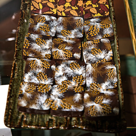The surfaces also feature colorful—and often intricate—visual designs, ranging from abstract patterns to small representational artworks. Needleman uses stencils (his own and by a French maker) and other methods to give some chocolates unique embellishments.