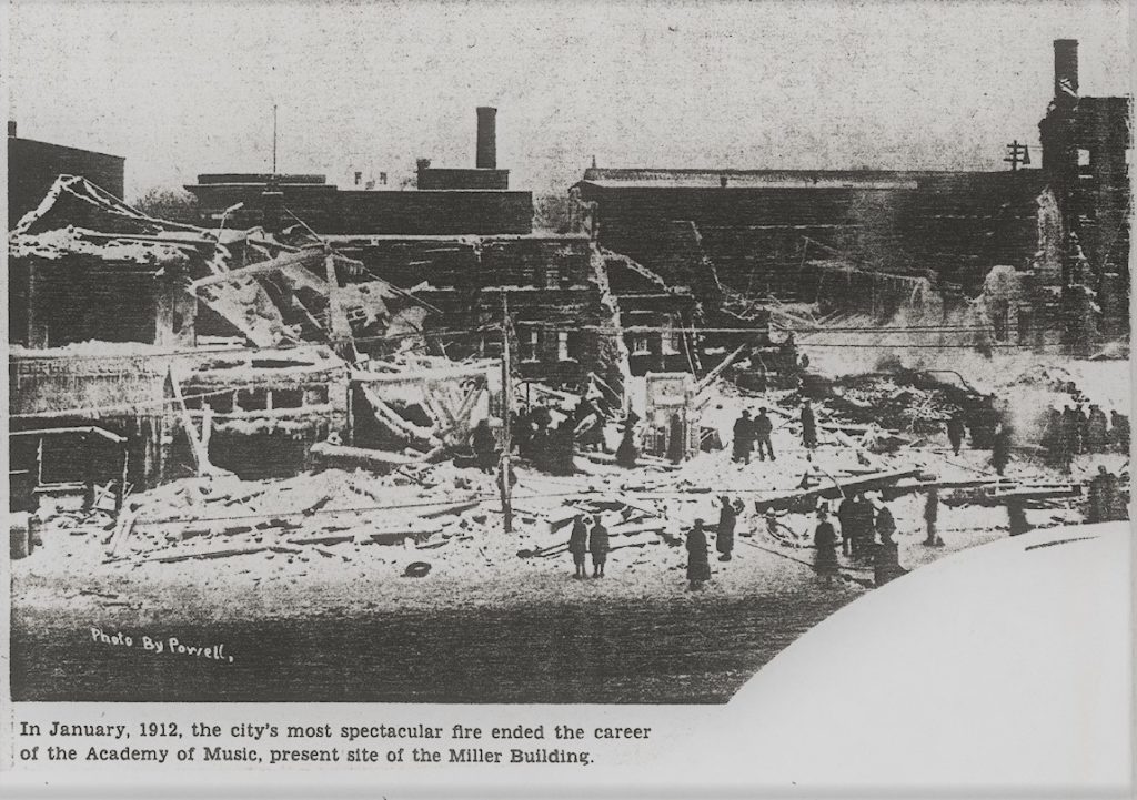 The final event in the 40-year history of the Academy was the fire of 1912. It was a conflagration that destroyed a great swath of the Pittsfield business district. Three imposing buildings went up in flames: the Academy of Music, the Miller Building and a warehouse. At his retirement 25 years later, fire Chief William C. Shepherd remembered it as the worst fire in Pittsfield history.