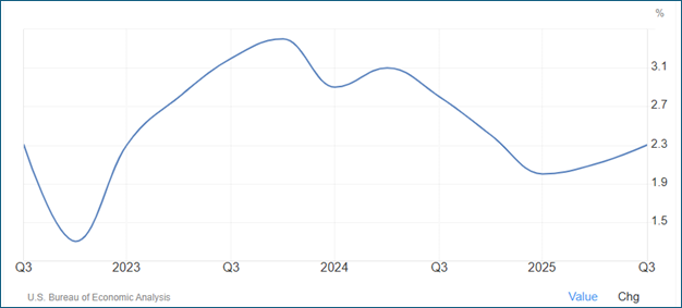 A common forecast range for real GDP growth is roughly between 1.7 percent and 2.6 percent. Inflation has cooled materially from its post‑pandemic peak; broad Bureau of Economic Analysis (BEA) price measures are running in the low‑to‑mid-two percent range, and forecasters generally expect inflation to remain contained even if it proves “sticky” in certain categories. The latest readings show year-over-year inflation has ticked up off the lows: