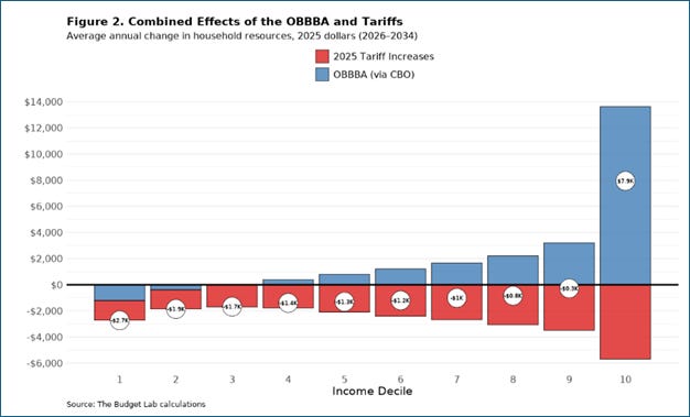According to the Budget Lab at Yale, the combined effect of the GOP-led tax bill (the One Big Beautiful Bill Act) and tariff increases will reduce household resources for everyone in the bottom 90 percent of wage earners over the next 10 years.