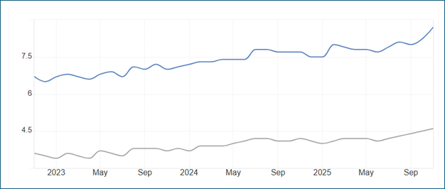 On monetary policy, the Fed’s Summary of Economic Projections (“dot plot”) has implied only modest additional easing, while market pricing has tended to be more sensitive to any sign of labor‑market softening. The key macro tension is straightforward: Tariffs and supply constraints can be inflationary at the margin, but weakening demand and a softer labor market are disinflationary. If growth slows faster than inflation falls, policy could ease more than the dot plot suggests; if inflation re‑accelerates, the Fed could stay restrictive longer.