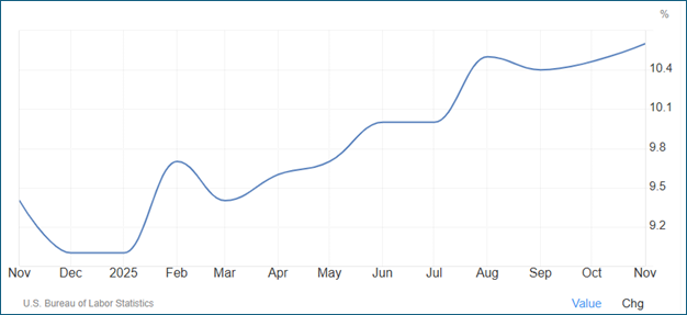 Youth unemployment has also moved higher. In the latest data, unemployment for workers ages 16 to 24 is about 10.6 percent, and the teen rate (ages 16 to 19) is higher still—an early warning that entry‑level labor demand is cooling.