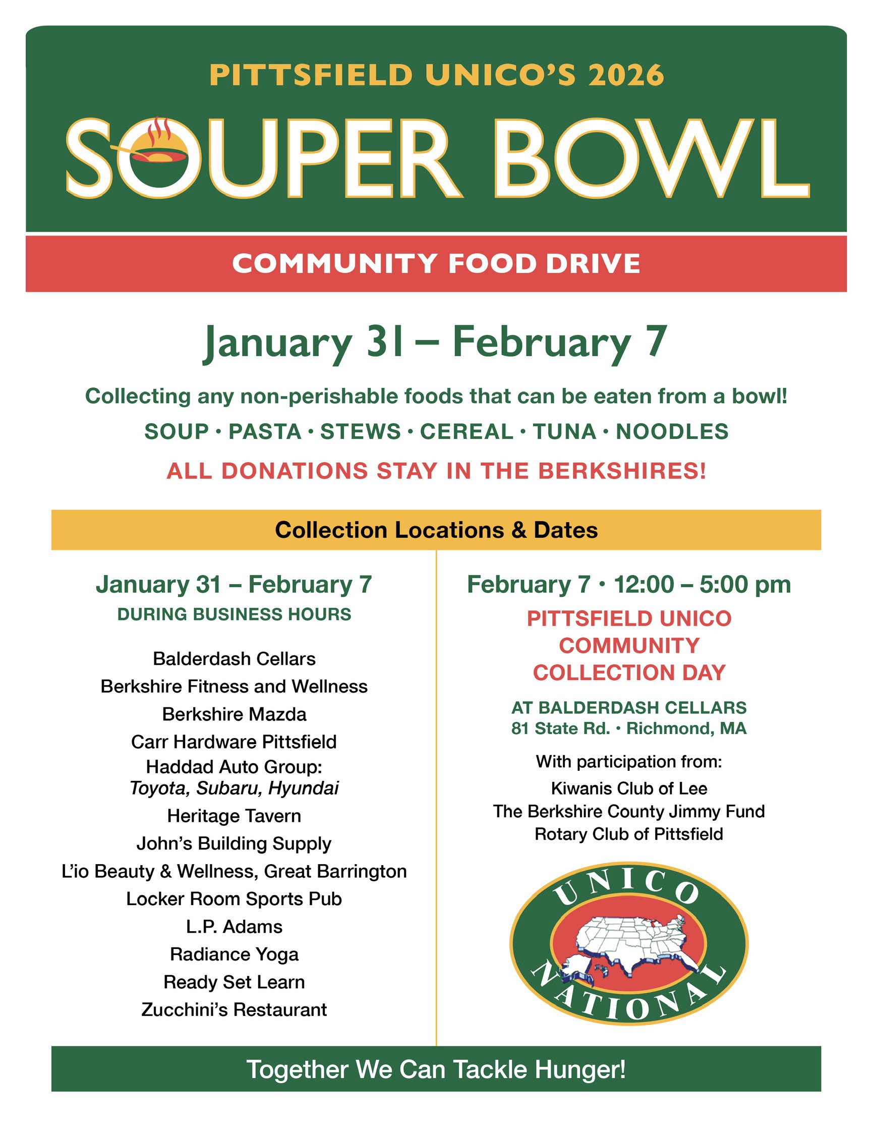 Balderdash Cellars 81 State Road, Richmond, MA, United StatesUNICO of Pittsfield will be holding a Souper Bowl Community Food Drive, beginning January 31, culminating on Saturday 2/7/2026. Help us score a touchdown for our local food pantries by making a donation of a non perishable food that can be eaten from a bowl. Soup, pasta, stews, cereal, tuna, noodles, will be collected at the […]