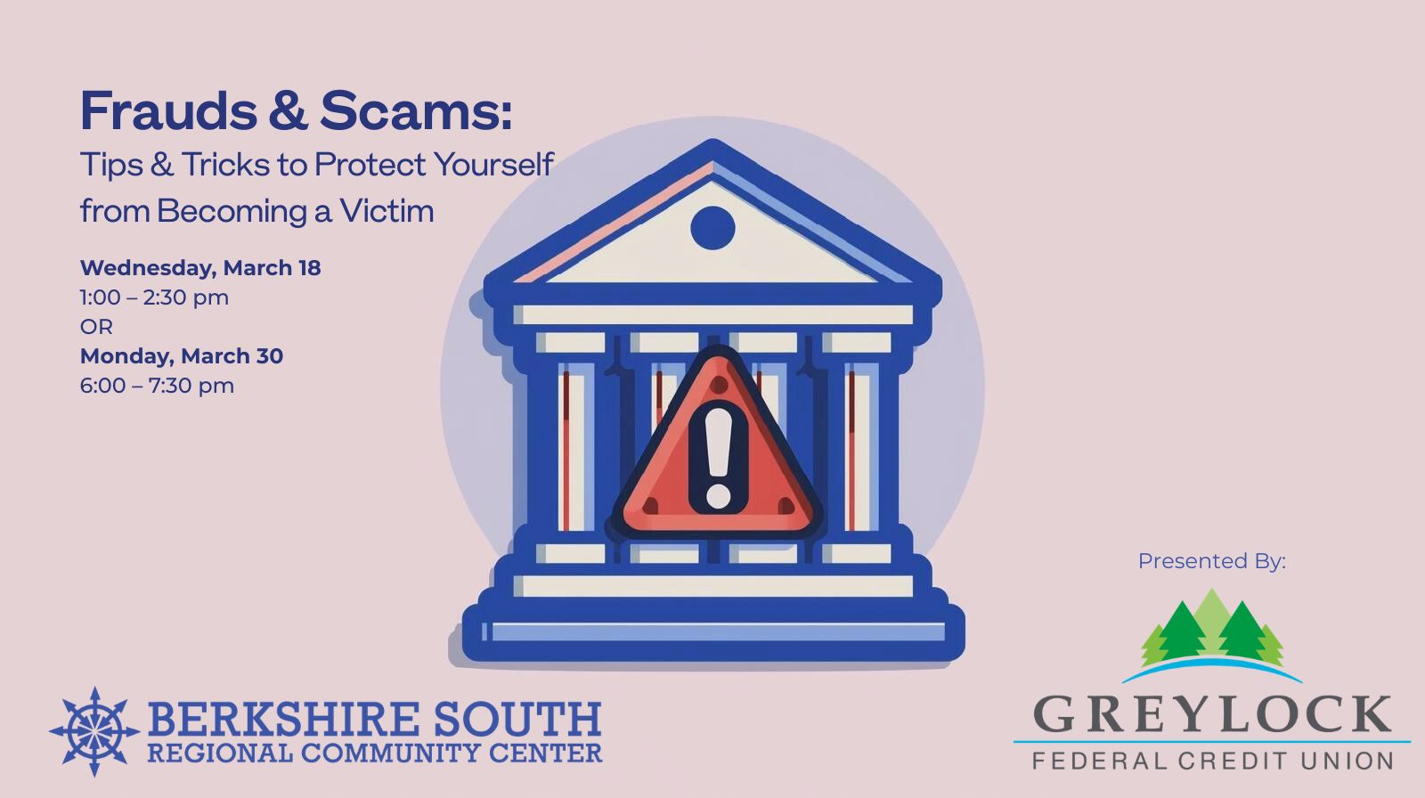Berkshire South Regional Community Center 15 Crissey Rd, Great Barrington, United StatesWednesday, March 18, 1:00 – 2:30 pm OR Monday, March 30, 6:00 – 7:30 pm Learn about the latest frauds and scams, as well the old tried and true scams […]