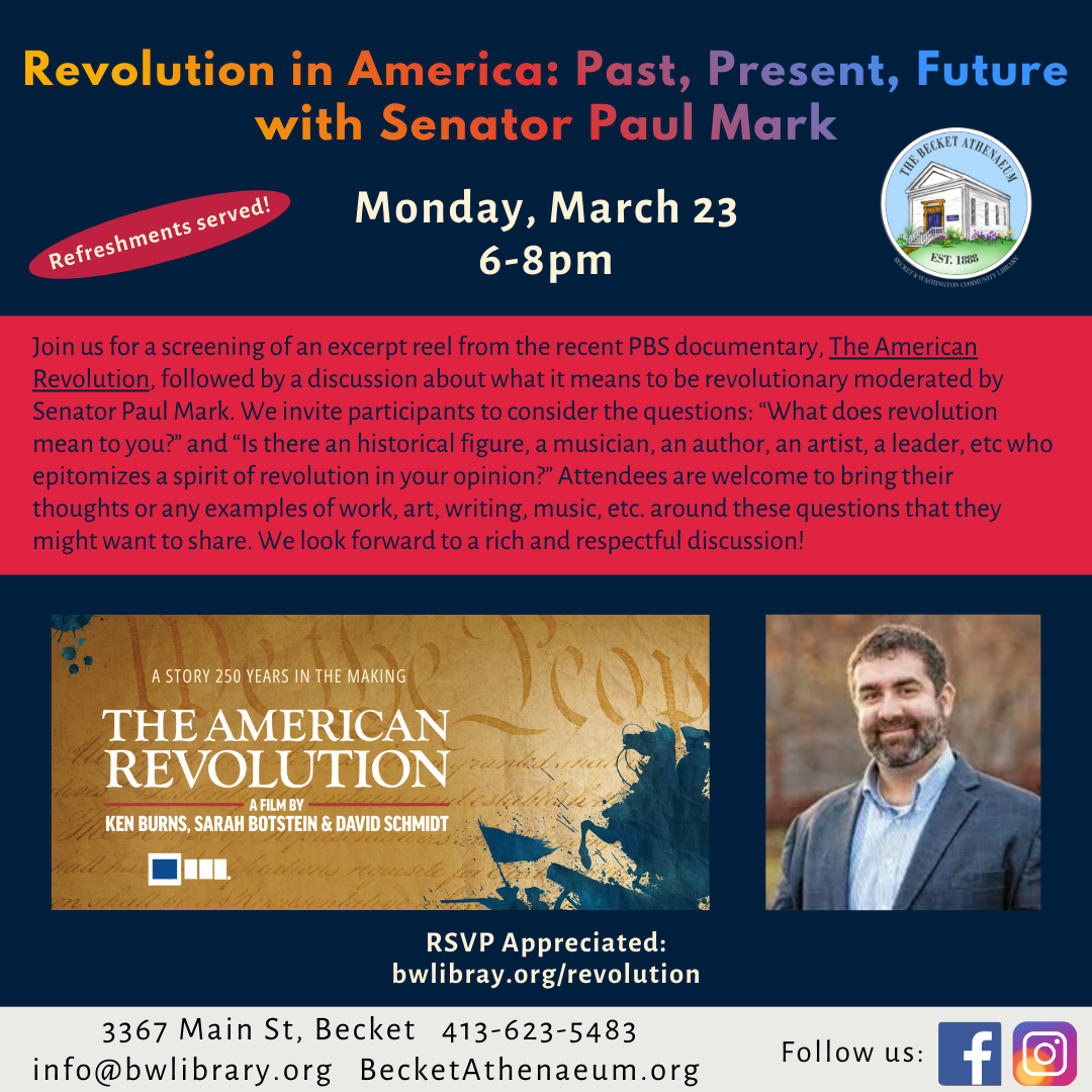 Becket AthenaeumJoin us for a screening of an excerpt reel from the recent PBS documentary, "The American Revolution," followed by a discussion about what it means to be revolutionary moderated by […]