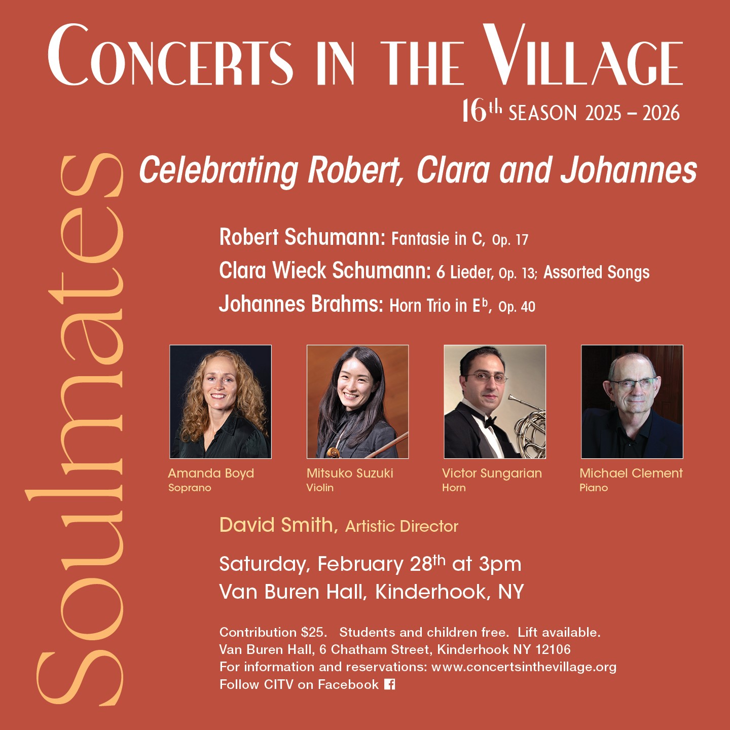 On February 28th Concerts in the Village continues its 16th Season with a program celebrating the remarkable musical and personal relationship of Robert Schumann, his wife Clara Wieck Schumann and Johannes Brahms, each a brilliant musician and composer.