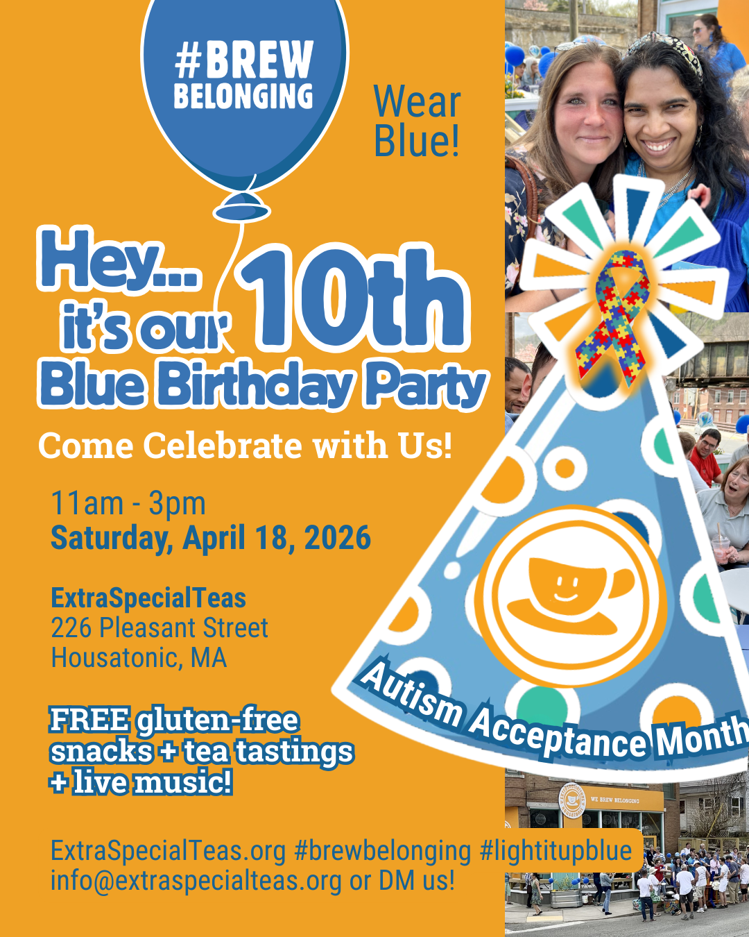 Come to ExtraSpecialTeas Blue Birthday Party (blue is for autism awareness, understanding and acceptance), which runs from 11:00 am – 3:00 pm on Saturday, April 18 at 226 Pleasant Street in Housatonic, MA. All community members are invited to wear blue, post party pictures to their social media (tag @extraspecialteas #lightitupblue #brewbelonging) and come into the teahouse to sample an “ExtraSpecial” brew of our signature blue tea named “Blue Skies,” and sample gluten-free brownie bites made by ExtraSpecial Servers and staff. Hot, iced and bubble teas are always available for purchase!