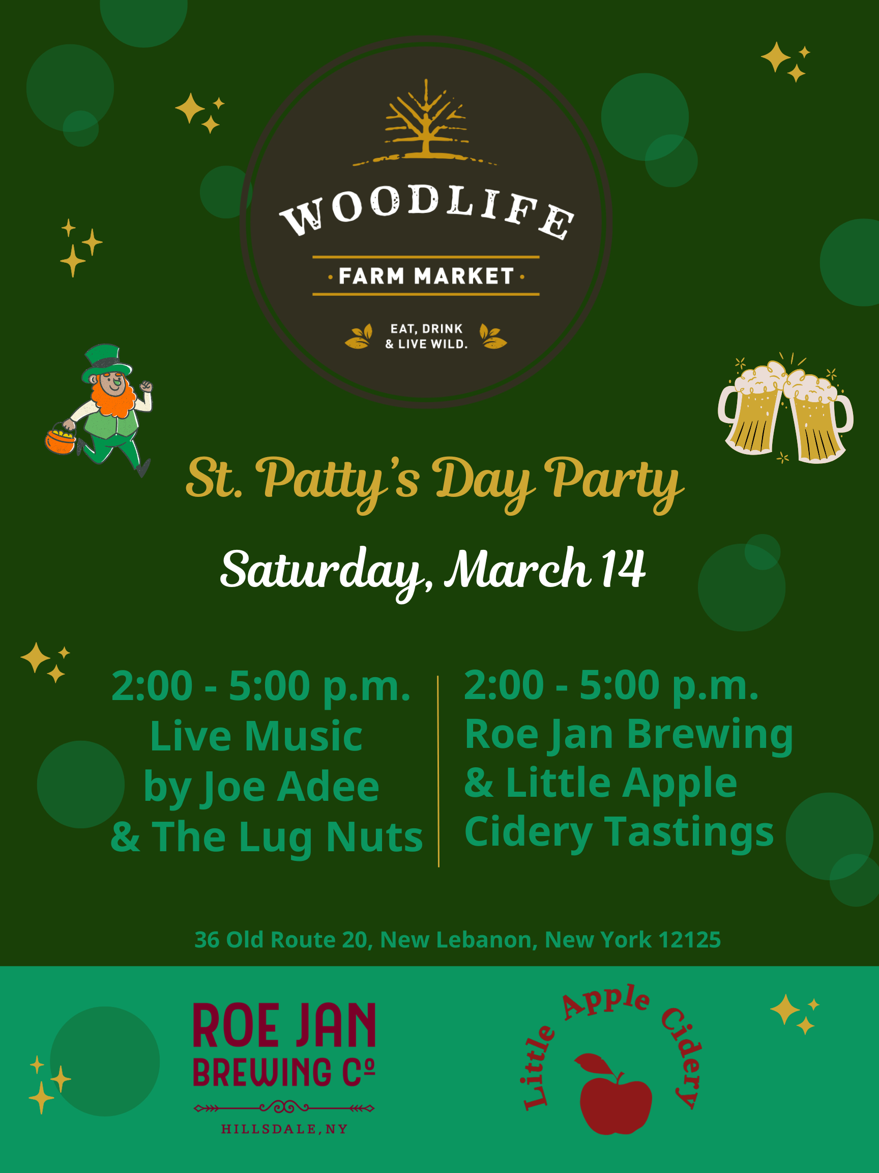 Woodlife Farm Market 36 Old Rte 20, New Lebanon, NY, United StatesFun filled day at Woodlife Farm Market with great food, drinks and music! Grab your friends and head on over for some St. Patrick's day fun. Roe Jan Brewing and Little Apple Cidery will be on site with tastings. Event kicks off at 2pm! We will be ROCKING in the heated greenhouse!