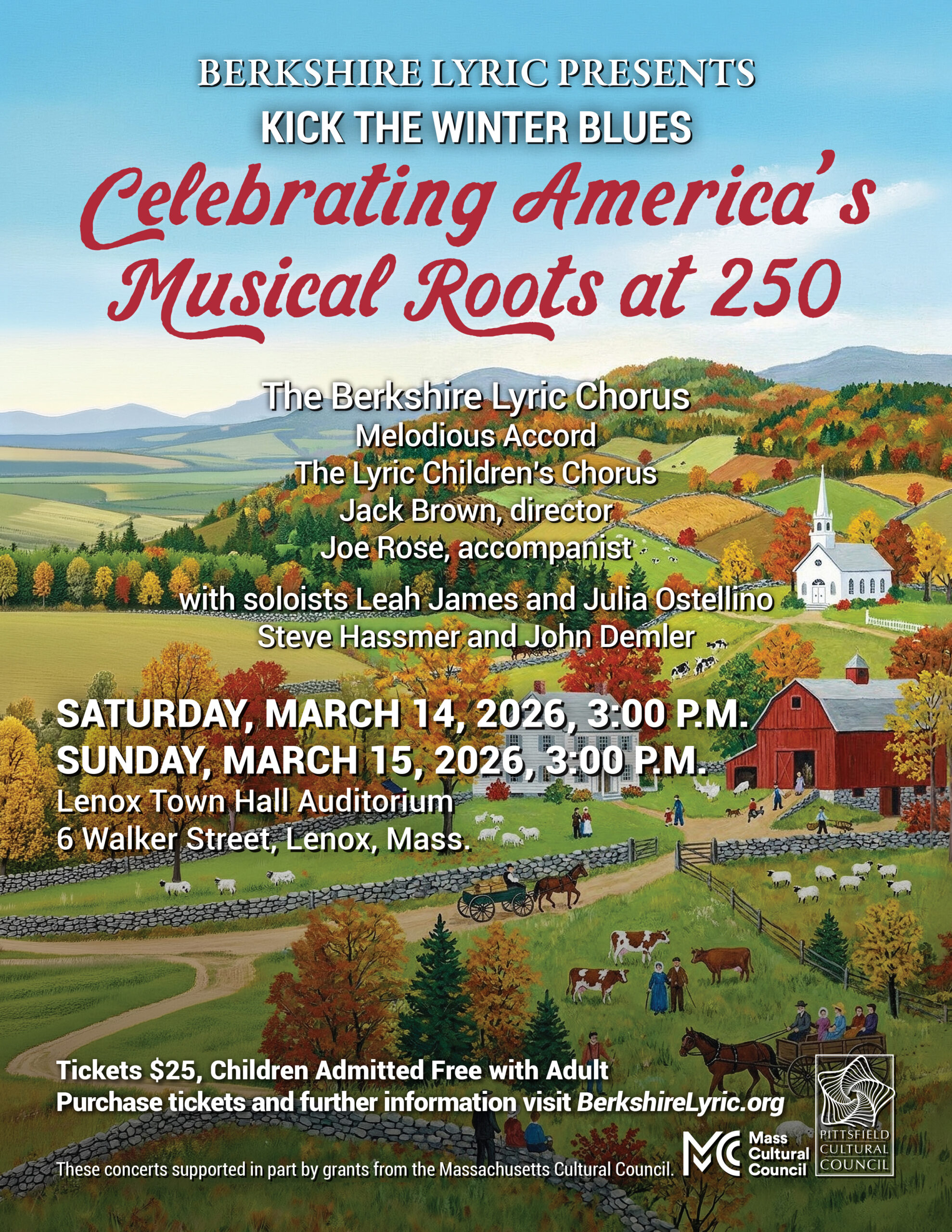 Lenox Town Hall 6 Walker Street, Lenox, MABerkshire Lyric is presenting their annual “Kick The Winter Blues” pop concerts on Saturday and Sunday March 14 and 15 at 3:00 at the Lenox Town Hall Auditorium. This year’s program is titled "Celebrating America's Musical Roots at 250.” The two identical concerts will feature music from the American folk and sacred choral traditions. The […]
