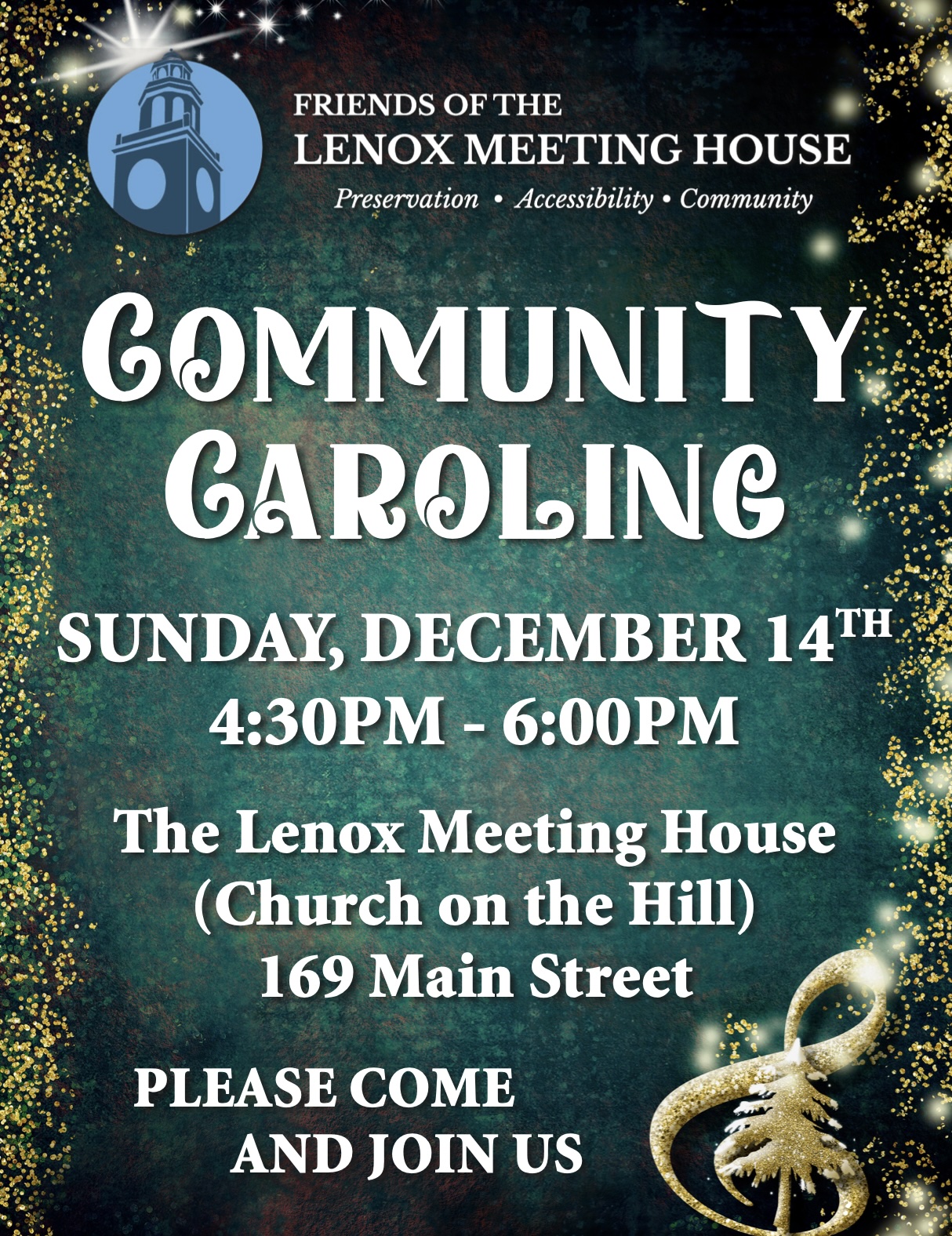 Lenox Meeting House (aka Church on the Hill) 169 Main Street, Lenox, MassachusettsJoin us for Community Caroling presented by the Friends of the Lenox Meeting House, Sunday, December 14 from 4:30 - 6:00 at the Meeting House (aka The Church on the Hill) 169 Main St. Lenox, MA. For more information: http://www.lenoxmeetinghouse.org Contact us at info@lenoxmeetinghouse.org or 413-637-3395.