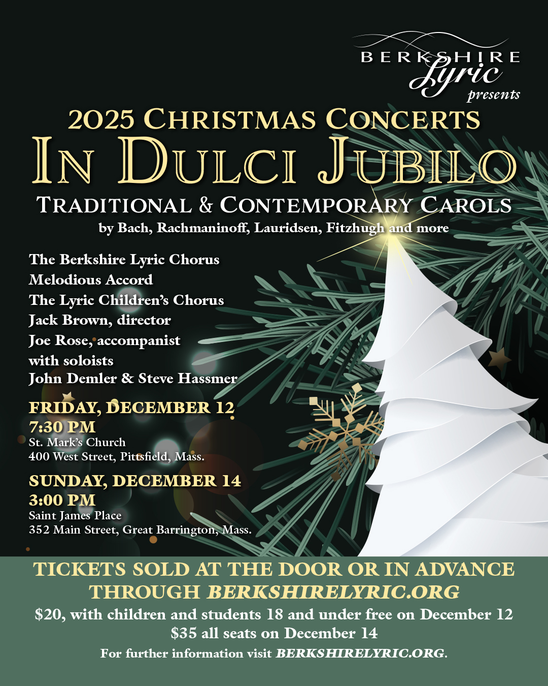 St. James Place St. James Place, Great Barrington, MA, United StatesBerkshire Lyric presents In Dulci Jubilo, the second of their three 2025 Christmas Concerts on Sunday December 14. The choral program will take place at 3:00 at Saint James Place on Main Street in Great Barrington. Traditional and contemporary a cappella carols by Bach, Rachmaninoff, Lauridsen, Randall Thompson, the Berkshire's Charlie Fitzhugh and others will […]