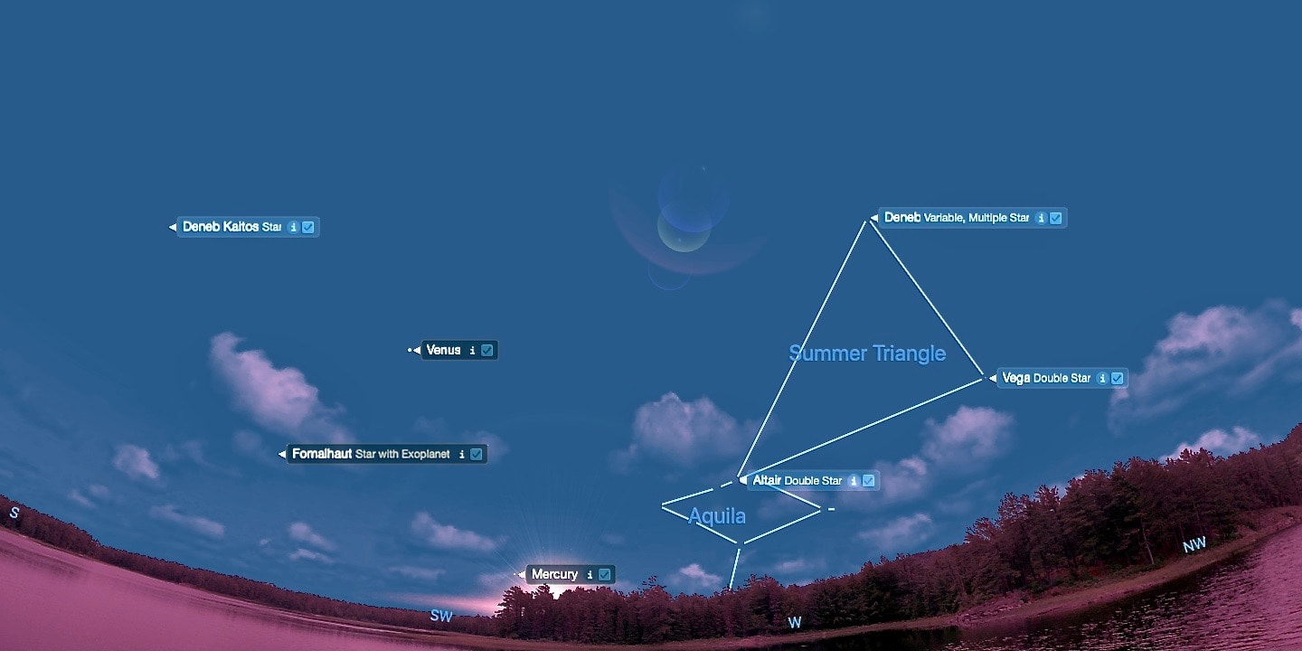 Altair, the brightest star in the constellation Aquila the Eagle, is the first point of the Summer Triangle to set. This evening, the 20th, Altair sets due west at 6:22 p.m., an hour and a half after sunset, which is at 4:52 p.m. this afternoon. By next Monday, the 27th, Altair disappears almost half an hour earlier, at 5:55 p.m., when sundown is at 5:01 p.m.. To observe the 0.75 magnitude star while it still appears as part of the Summer Triangle, look early this week from an unobstructed view to the west.