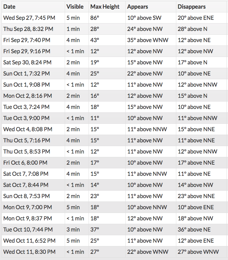 Last week the station was visible higher in the sky. For choices over time, consider signing up directly from NASA for notification of favorable visibility. I was alerted the morning of each of the evening sightings I described.