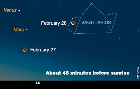 The moon and Venus may be visible until about 6:15 a.m. Venus -4.61 magnitude on February 20, decreasing to -4.51m on March 5. Mars -1.30 m, Mercury 0.00 m. If you plan to adventure out before dawn to see Venus rise, know that she’s up earlier every day: February 20 at 4:20 a.m.; March 5 at 4:05 a.m. In hilly terrain and other obstructed views, expect Venus later by half an hour or more.