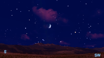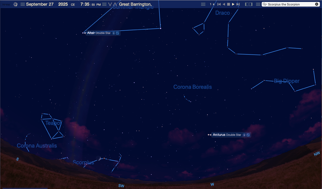The diagram shows celestial relationships on September 27. Observe the changing positions of the stars close to the south-southwest horizon through mid-October, when Antares, outstanding at 1.0 magnitude (the smaller the number the brighter the celestial object), and with it the Scorpion, disappear from the evening sky.