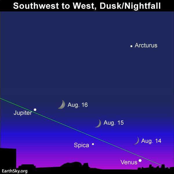 Shooting stars may be seen all over the sky. It is useful to know the radiant because the incidence of meteor sightings increases as the radiant rises higher above the horizon. Perseid meteors are more intense after midnight and especially as Perseus climbs highest before dawn. Conditions are propitious all week as Earth moves through the debris spread along the comet’s orbit. In dark-sky locations, anticipate a maximum of 70 meteors per hour as the shower peaks overnight Saturday the 11th until dawn on Sunday the 12th and again overnight Sunday until dawn on Monday the 13th. Some sources predict best viewing overnight Sunday.