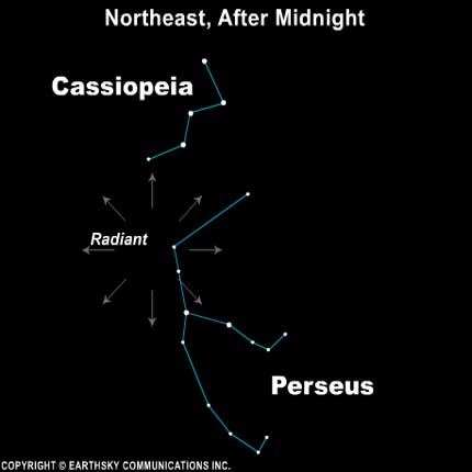 The meteor shower associated with this comet is named for the constellation Perseus, which occupies the place in the sky from which the shooting stars seem to originate, or radiate. Perseus, the radiant, rises above the northeast horizon around 11 p.m. He is best seen in dark skies. It is worth noting that Perseus travels below the easier to identify “W” star pattern that is Cassiopeia.
