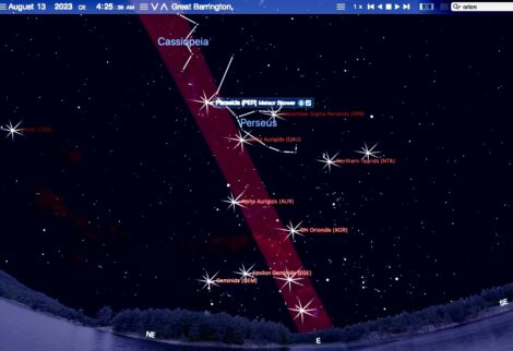 Schema of the constellation Perseus, the mythic Greek hero, radiant of the Perseid meteor shower. On August 13, at 4:25 a.m., Perseus approaches zenith. We may imagine the starbursts to be shooting stars seeming to radiate from the constellation in all directions. This StarryNight7 image, however, is designed to show the radiants of many of the year’s meteor showers. Perseus climbs above the northeast horizon just before midnight on August 12 and approaches zenith in this depiction of its position before dawn on August 13. Image courtesy of Judy Isacoff/StarryNight7.