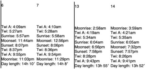For August 6, 7, 13, 14: Astronomical Twilight in the morning marks the beginning of the end of true darkness, when the sun is 18 degrees below the horizon. Civil Twilight begins in the morning when the center of the sun is 6 degrees below the horizon—it is quite light—and ends at sunrise. Excerpted from Sunrise-Sunset.com.
