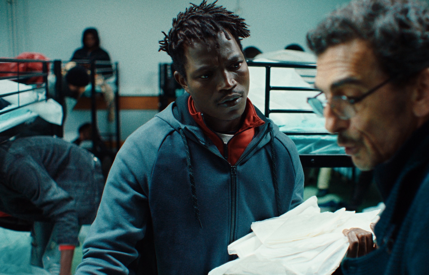 Lojkine’s film follows a Guinean food-delivery driver (Abou Sangare, striking and subtle in his first screen role) through his harried and exhausting job, racing long distances in bike lanes past heavy Paris traffic to deliver meals and then struggling to catch the last bus to the refugee shelter where he sleeps with other immigrants—otherwise he ends up sleeping in the rough. His pay is small and determined by how many jobs he completes, but a slice of those commissions is taken by the man who operates his account. Those scenes of him at work are tracked from behind and jaggedly edited to build tension and a sense of immediacy. Watching the film, my mind rapidly went to all the New York City immigrants delivering food on their motor bikes who are in danger of masked ICE officers swooping down and arresting them and sending them to El Salvador or other forsaken places. In contrast, the Parisian police in the film may play sadistic games when they stop Souleymane, but they ultimately let him go with his illegal identification intact, for Souleymane is an undocumented immigrant who is seeking asylum through the French Office for the Protection of Refugees and Stateless Persons (OFPRA). In two days, he has an in-person interview where he plans to provide a fabricated story about escaping prison after being arrested for political activism in Guinea. The apolitical Souleymane must memorize a political tale to convince the questioner. The story has been supplied by a man who provides the script to many migrants, and he even adds documents to make it more convincing.