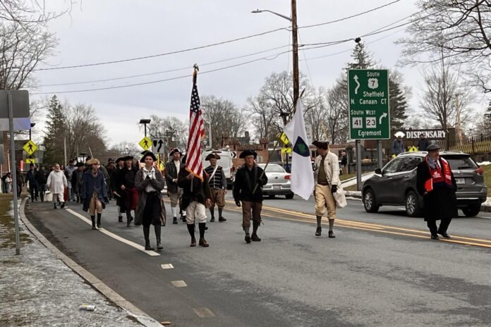 As the reenactors slowly made their way from the Historical Society to Town Hall, a commemorative event was held at the Mahaiwe Performing Arts Center featuring town representatives from Alford, Blandford, Egremont, Great Barrington, Monterey, Otis, Russell, and Sandisfield, along with various state representatives from Massachusetts and New York.
